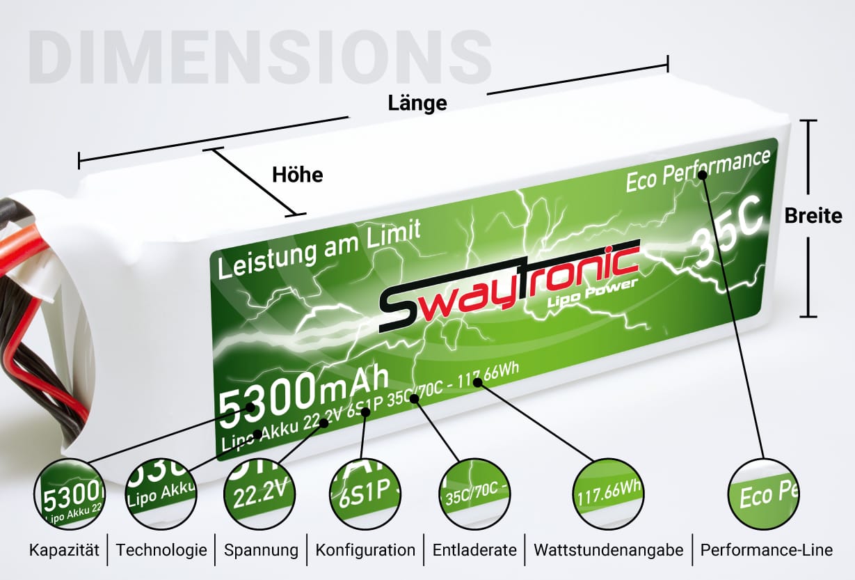 Suchst Du Leistung zum besten Preis? Dann bist Du mit der Swaytronic Eco-Performance genau richtig. Nicht nur die Preis-/ Leistung dieser Sparte wird Dich überzeugen – mit der Eco-Performance deckt Swaytronic bewusst ein breites und tiefes Sortiment an LiPo-Akkus ab. Hier findest Du garantiert den richtigen Akku – zum besten Preis.