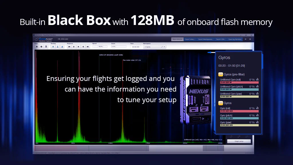 Mit seiner fortschrittlichen STM32F722-MCU und dem 6-Achsen-MEMS-Bewegungsverfolgungsgerät TDK ICM-42688-P, das ein 3-Achsen-Gyroskop und einen 3-Achsen-Beschleunigungsmesser kombiniert, sorgt der NEXUS-Flugcontroller für präzise Steuerung und Flug. Ein großer integrierter Flash-Speicher von 128 MB sorgt dafür, dass Sie alle Ihre Flüge zur Feinabstimmung und Anpassung protokollieren können.