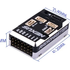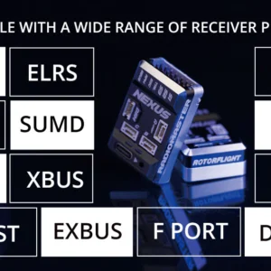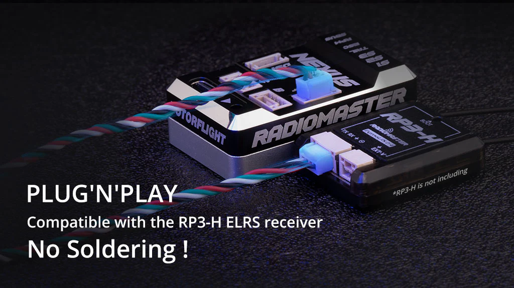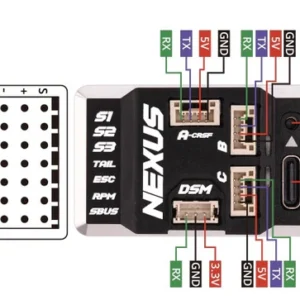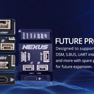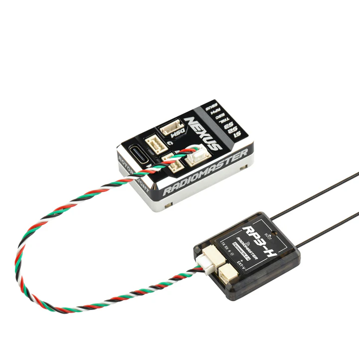 Unsere lötfreien Plug’n’Play RP3-H ExpressLRS-Empfänger verfügen über ein verriegelbares Steckersystem, um eine stabile Verbindung zwischen Steuereinheit und Empfänger zu gewährleisten. Für die Verwendung mit Ihrem ausgewählten Empfängertyp stehen auch DSM- und S.BUS-Anschlüsse zur Verfügung. Der NEXUS verfügt außerdem über Multifunktionsanschlüsse für zukünftige Erweiterungen.