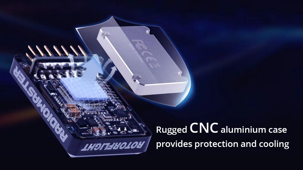 • Der NEXUS-Flugcontroller ist kompakt und robust. Das CNC-Gehäuse schützt nicht nur die internen Komponenten, sondern fungiert auch als Kühlkörper, um die Elektronik kühl zu halten