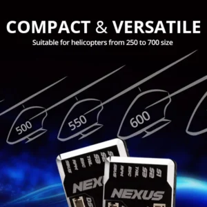 • Der NEXUS misst nur 41 mm x 25 mm und ist nur 13 mm hoch, sodass er perfekt für Helikopter jeder Größe geeignet ist, einschließlich 250/450/500/550/600/700 Hubschraubern