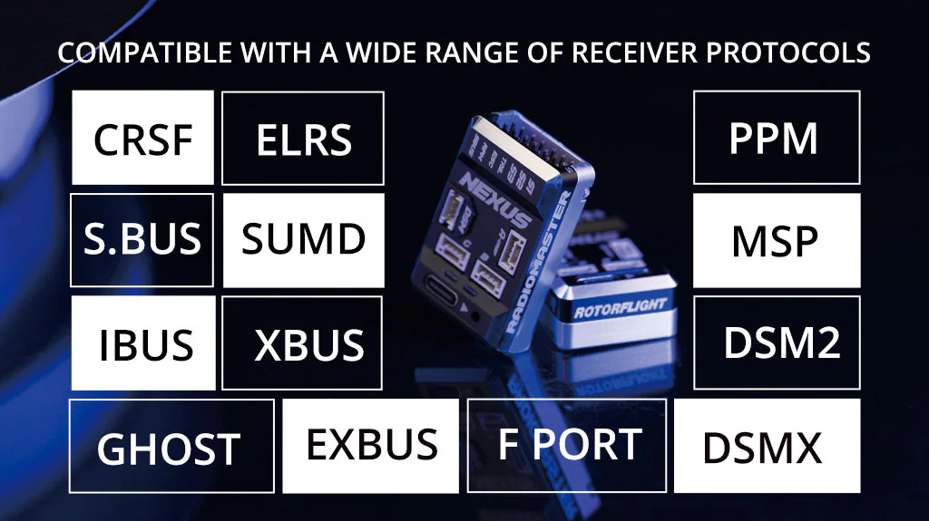 • Receiver Support: CRSF, ELRS, GHOST, S.BUS, SUMD, IBUS, XBUS, EXBUS, PPM, MSP, DSM2, DSMX
