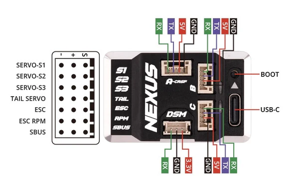• Der NEXUS-Flugcontroller unterstützt eine breite Palette von Heckmotoren und Heck-ESCs (760 μs / 1520 μs).