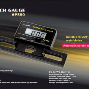 Developed by the R&D team in Align, the new AP800 digital pitch gauge is suitable for flybar and flybarless helicopters. The built in digital gyroscopic sensor is capable of detecting pitch angle, with result displayed through high contrast LCD screen, providing a simple and precise way of measuring pitch angle.