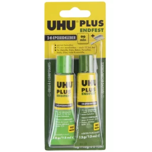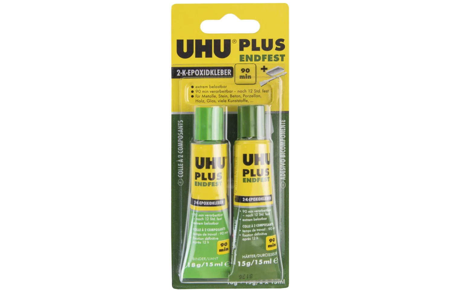 Der Zweikomponenten-Epoxidharzkleber UHU Plus Endfest eignet sich besonders für hoch belastbare Verklebungen an nahezu allen festen Werkstoffen. Die Klebeverbindung ist dabei schlagfest sowie alterungs- und feuchtigkeitsbeständig. Nach dem Vermischen der Komponenten beträgt die Verarbeitungszeit bis zu 90 Minuten, wobei die Härtezeit und Endfestigkeit von der Temperatur abhängen.